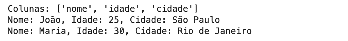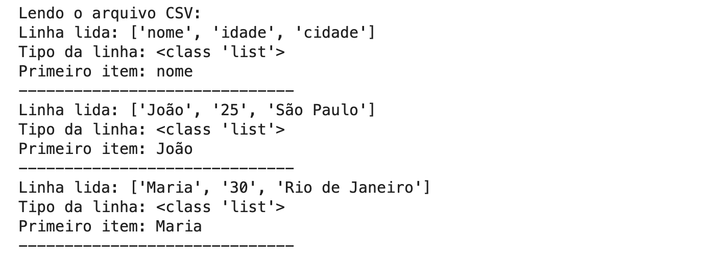 No código acima percorremos linha por linha do arquivo. Cada linha é uma lista com os valores da linha. Por exemplo: ['João', '25', 'São Paulo']