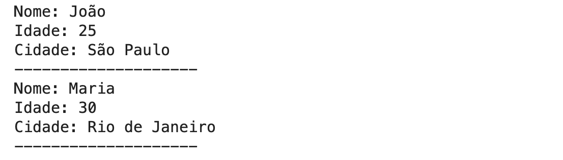 print(f"Nome: {linha[0]}, Idade: {linha[1]}, Cidade: {linha[2]}")