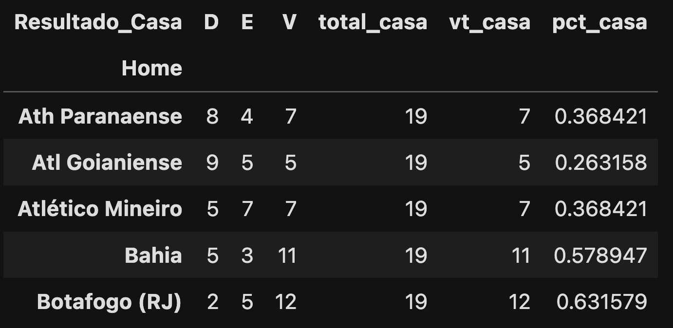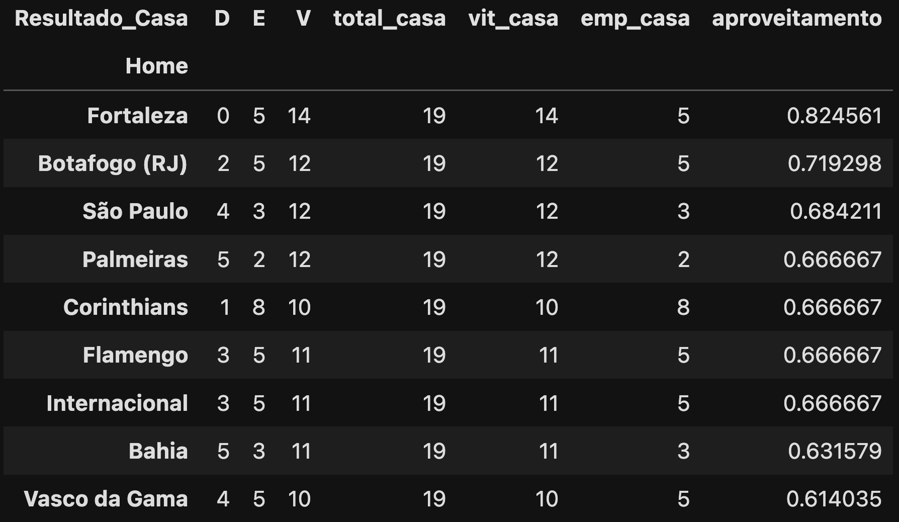 Já temos os dados que precisamos. Vamos agrupar tudo por times mostrando os resultados de cada time em casa. E já vamos adicionar o aproveitamento também.