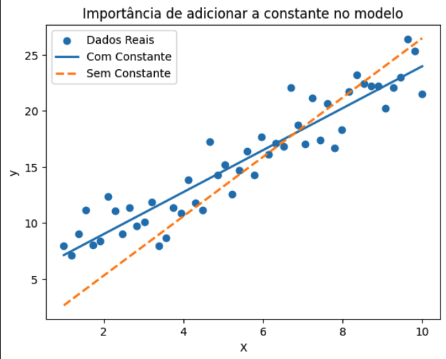 Outro ponto fundamental é não esquecer do intercepto, usando o sm.add_constant(X). Como vimos, forçar a linha a passar pela origem pode distorcer completamente o modelo. Na prática, isso significa perder a capacidade de representar adequadamente os dados reais.