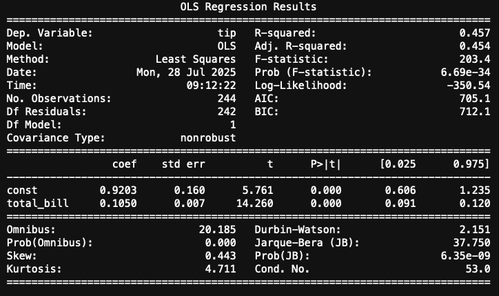 O valor do R² (R-squared) foi de 0.457, o que significa que cerca de 45,7% da variação no valor da gorjeta pode ser explicada pelo valor da conta. Em outras palavras, quase metade da variação nos valores das gorjetas é explicada pelo tamanho da conta. Para um modelo simples, esse é um resultado considerado razoavelmente bom, já que estamos usando apenas uma variável preditora.