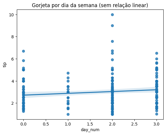 plt.title("Gorjeta por dia da semana (sem relação linear)")
