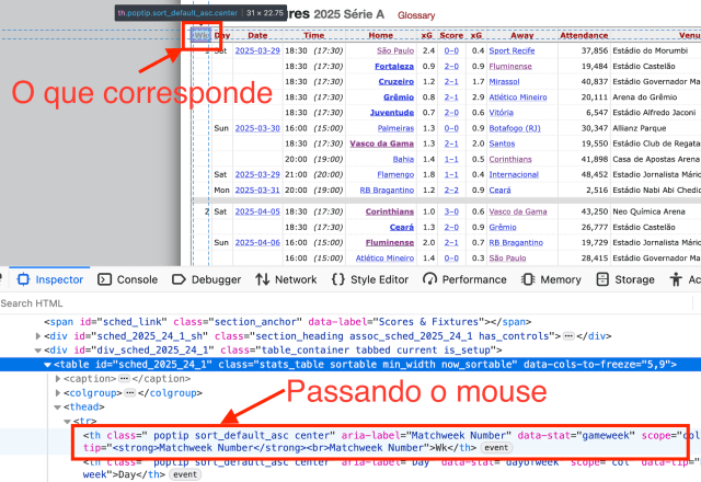 Agora já temos a tabela separada, vamos trabalhar com os dados da tabela. Pode observar que em html, o cabeçalho é sempre ``. No seu Firefox, quando colocar o mouse no elemento, mostrará na página.