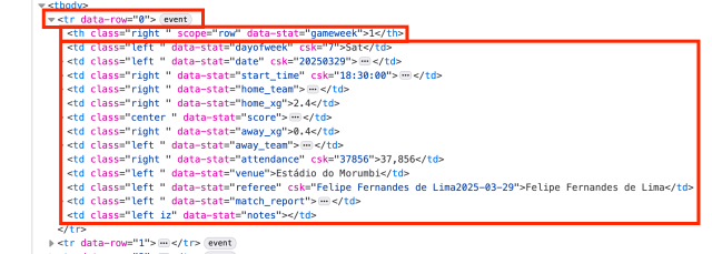 Para pegar o restante do conteúdo é um pouquinho mais complicado. Em uma linha da tabela você tem tr, th e varios td dentro do tr. Vamos precisar trabalhar cada um deles para pegar todos os jogos.